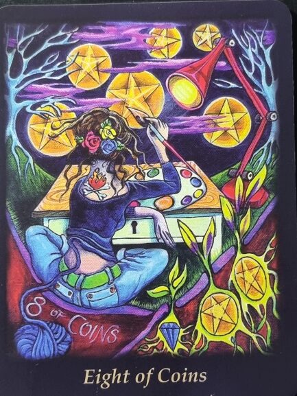 Yet, when I first selected this card to photograph, my eye was drawn to the egg timer and the idea of needing to make the choice to follow your heart before time runs out, or at least it feels as if it does. Time keeps passing while we sit in indecision. Now as I look at the card again, I see the bull I hadn’t even noticed before, (how I don’t know, but I do – it wasn’t the message I needed at the time), and the need to push past comfort zones and make a decision comes up. I realise just how much I needed to see this card right now. Plus it reinforces that their is no such thing as just picking a card to photograph. There is always a message. Team it with the Page of Coins also pictured below and things are becoming so much clearer.