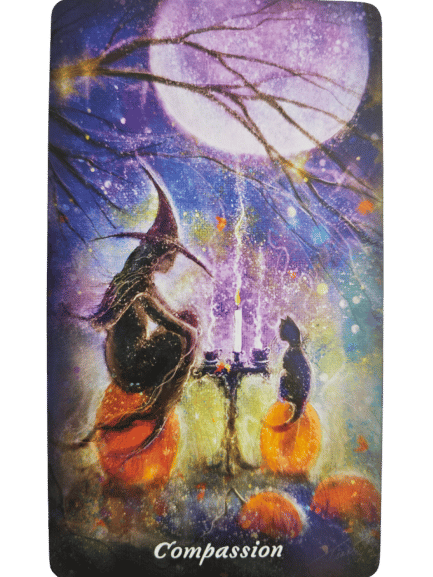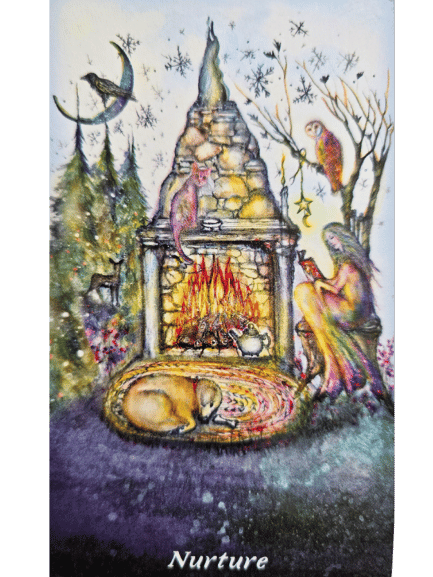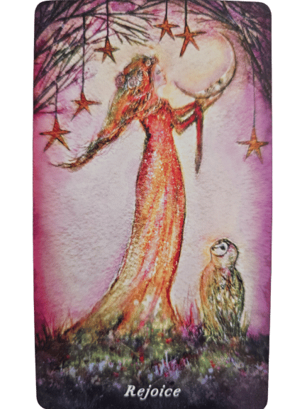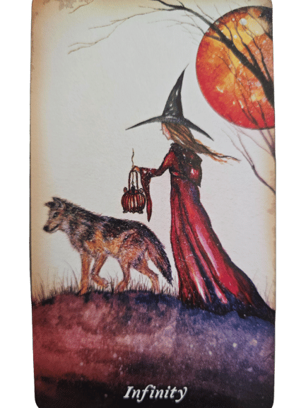 Combining the images of the witch and the wolf walking towards the moon and the raven and the keyword “Infinity” reminds that this is an ongoing process. We need to make peace with this also. As I kept looking at the card I noticed another face start to appear in the moon and the word growth came to mind. This is how we grow.