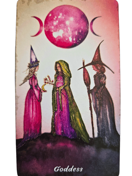 I like the quotes. The quote for the “Goddess” card reads, “Every stage of life lays the foundation for the next stage of life. Treasure each stage of life.” Then, the meaning asks you to consider what comes to mind when you think of the Triple Moon Goddess. For this entry she provides keywords for each phase of the Triple Goddess along with the associated moon phase. The information for the card wraps up with this intention:
