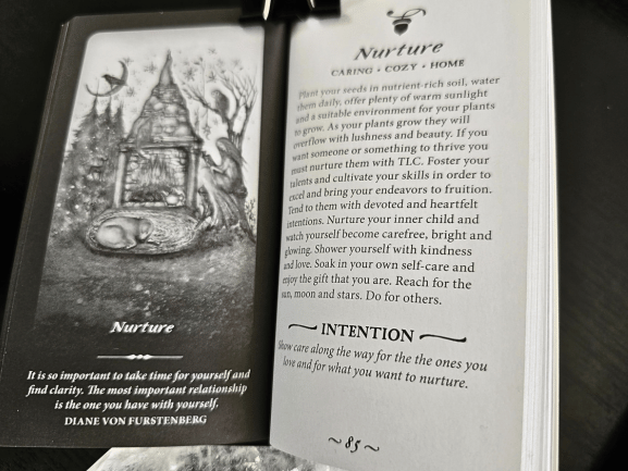 As you can see below, on the left hand page there is a black and white image of the card and a quote. On the right, the page is headed by a card logo of sorts that is unique to each card, followed by the card title, three keywords, the card meaning, and an intention.
