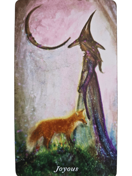 Here I notice that she isn’t looking at the fox. Also, the card is titled “Joyous” but the image doesn’t give me that energy. It makes me think she’s looking in the wrong place. There’s some misdirection going on. Connecting that back to The Magician article about manifestation suggest I have something to think about.