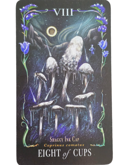 For the Cups suit, the mushrooms are linked to water in some way. They may release egg sacs when touched by a drop of water as in the Fluted Bird’s Nest Fungus on the Ace of Cups. Or they may live partially submerged like the Water Club Mushroom pictured above on the Nine of Cups. Another link is suggested on the Eight of Cups. The Shaggy Ink Cap liquifies itself (deliquesces) after releasing spores or, as I discovered, after being picked. I’m a book lover but I really wonder how I survived before Google. Some of the blue colourings of mushrooms on the Cups cards are stunning.