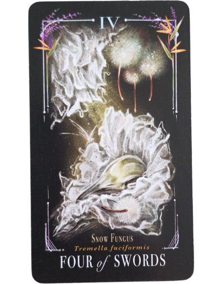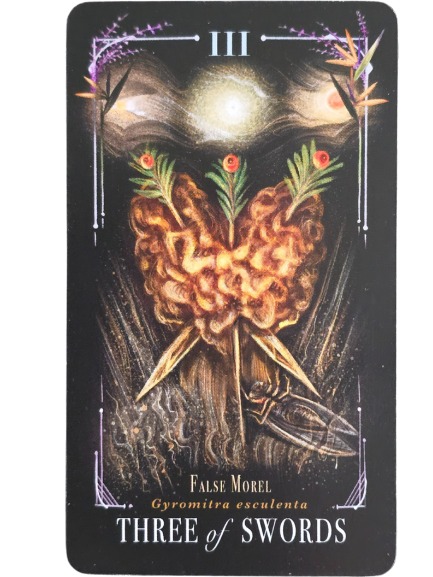 I spoke earlier about the attention to detail in Midnight Magic. The Three of Swords provides a classic example. Look at the Bird of Paradise flower in the border. Rather than being bright as it is in each of the other Swords cards it is blackened suggesting that paradise is lost. Also, when I look at the common name of the mushroom chosen, False Morel, I feel it may be a message in itself at some stage because it really stood out to me. Unlike morels, this one is poisonous. Unfortunately it can be hard to tell the difference.