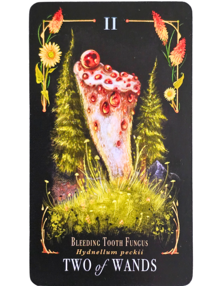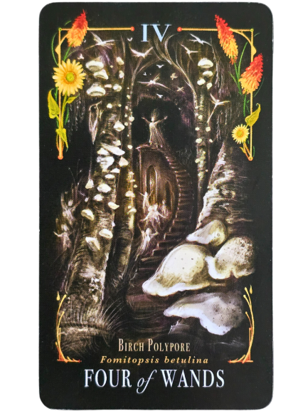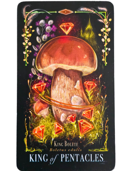 Pentacles have green, gold or sepia toned mushrooms that are either “hidden, buried or financially revered.” Several cards also feature gemstones and crystals.