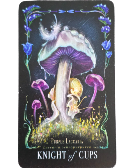 The Seven of Swords features another title that jumped off the card at me – Amethyst Deceiver. Mushrooms really do have some great names. This mushroom is edible but it can absorb arsenic. That knowledge can be construed in multiple ways – protection for one. Or it could be a link to the idea of keeping ideas to yourself or to the maxim to “do no harm.” Everything on the card has a story to tell.