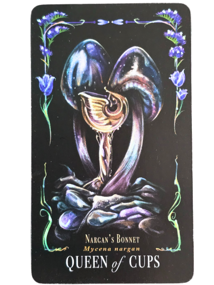 I Googled to see actual images of many of these mushrooms because so many seemed just to beautiful. What I discovered is that, for the most part, they are faithful renderings. When I looked at the Nargan’s Bonnet mushroom on the Queen of Cups I saw a connection to the Universe which taps into the intuitive aspect of this Queen.