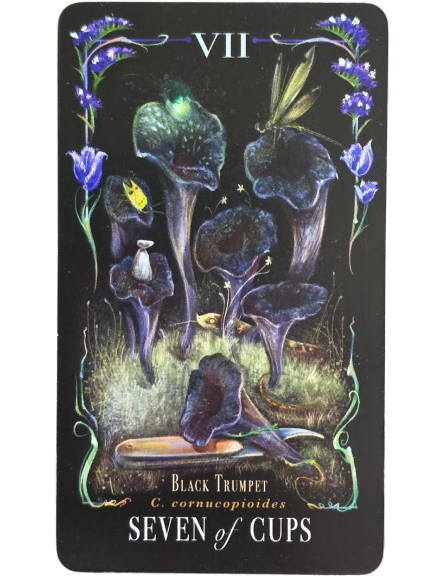 Cards such as those above indicate the RWS influence. This clone-like feel features in many cards without feeling overly contrived. Taken together, the Six of Pentacles and the Seven of Cups provide an interesting contrast. The Six of Pentacles is light in tone and energy. It is giving and open and the crystal gives it a magical and cosy feel whereas the Seven of Cups sitting next to it feels like a warning. What someone may be offering may seem wonderful but you need to look closely at your options. Black Trumpet mushrooms are edible but people that look for them say they can be hard to find. You need to put in the effort. Taken together these cards give me “if it seems to good to be true it probably is” vibes.