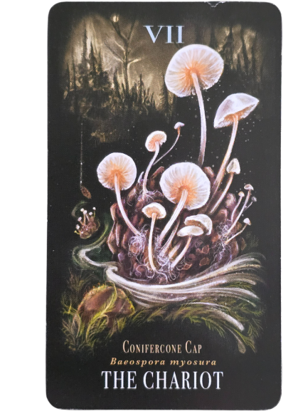 VII The Chariot is a great example of the link between mushroom type and tarot. It reads: