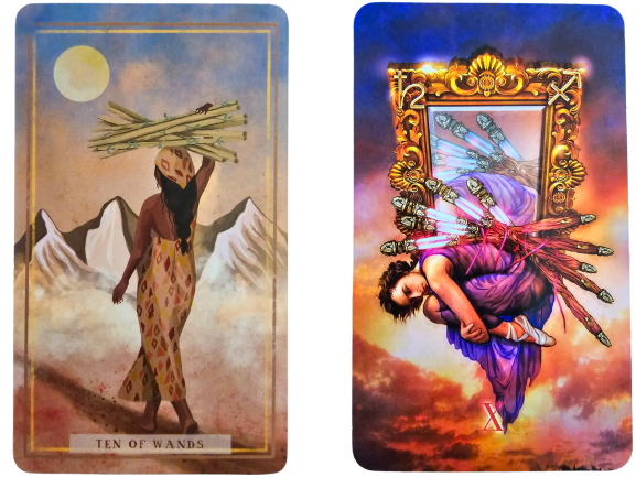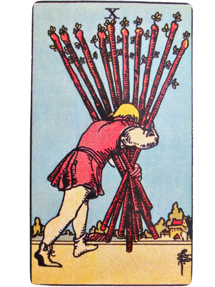 I’ve heard this card interpreted in many ways. One of which is that he is nearly there, one final push and he will have completed his tasks. But then, what is the illusion? Does he want to be free of his “burdens” or does he identify with them? Is he carrying the wands in that way to show that he uses busyness as an avoidance strategy? Would he rather avoid going home? Or is it that he is trying to garner our sympathy? Is he a victim more so than the person on the 10 of Swords? So many questions.