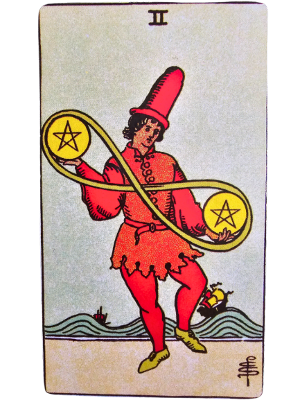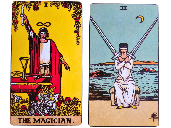Look up the Two of Swords and invariably one of the keywords will be Indecision. But what does it mean when that indecision is played out on a stage? As with many of the RWS cards this figure is androgynous. Is she The Magician without the security the red coat affords? I often associate the colour red with the base chakra so does this mean that the indecision is due to a lack of basic resources? Does the person want to get to the other land mass but doesn’t have the means to do so? Is this a desire to move but without the financial resources to make it happen? Maybe as the Amberstone’s third idea suggests, maybe that’s merely a projection?