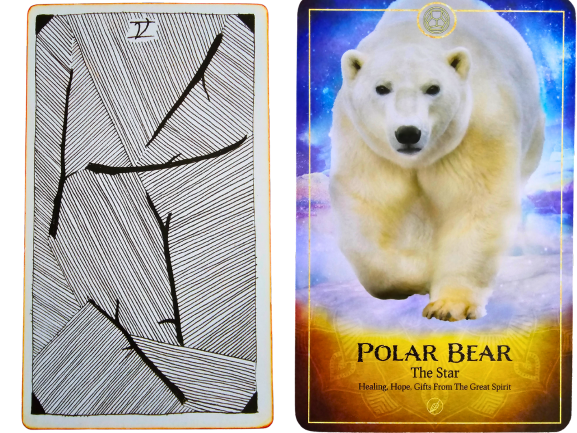 I am transforming the image, regardless of whether it’s the appearance of a polar bear in The Ark Animal Tarot or a series of black lines and sticks drawn by Kim Krans for her Wild Unknown Tarot, into a relatable story. To do so I draw meaning from my life, my knowledge, my question, any other cards in the spread, and most directly, from the elements included in the card.