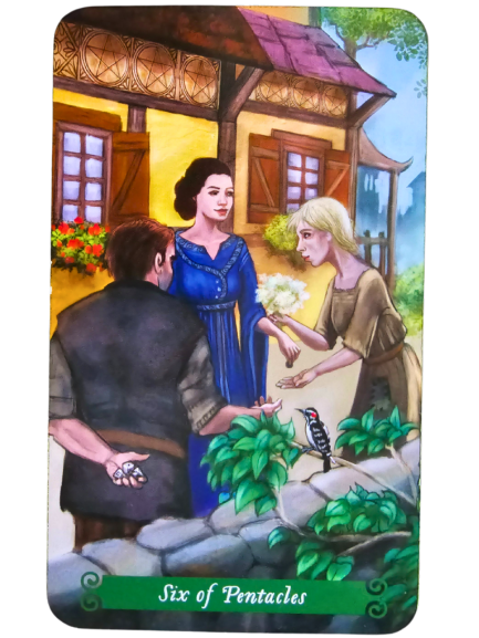 Plus, if things aren’t what they seem, what is on the blue cloak? Are they patches, as I first thought, or is it a pocket already overflowing with resources? Could this man actually be like the man with his hand out on the Six of Pentacles in The Green Witch Tarot pictured above?