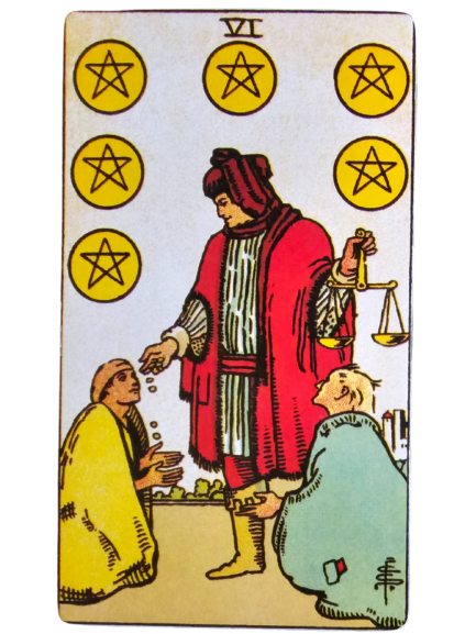 Could it be that the other man with the two pentacles above his head did, as the the figure in the Two of Pentacles, (another stage card), does? Did he weigh up whether or not to help? Did he keep most of what he had to offer hidden under his “hat” rather than offering any assistance?