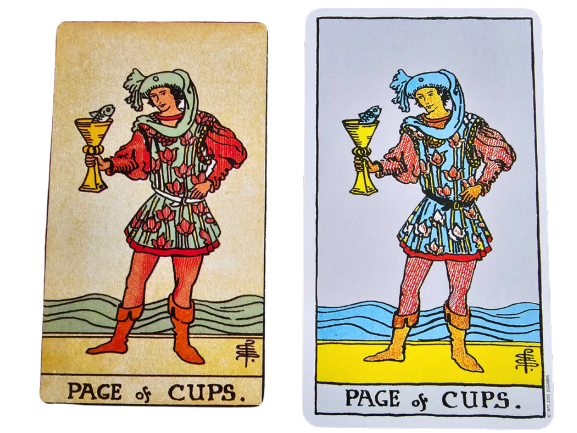 That fish doesn’t belong in the cup. It belongs in the sea behind him. Plus, if all was as it seems, why is the sea not calm and tranquil and the background blue or yellow? Why is it a murky brown on my Original Rider Waite Tarot and grey on the Rider Tarot? Is he offering something he isn’t ready, or able, to offer?