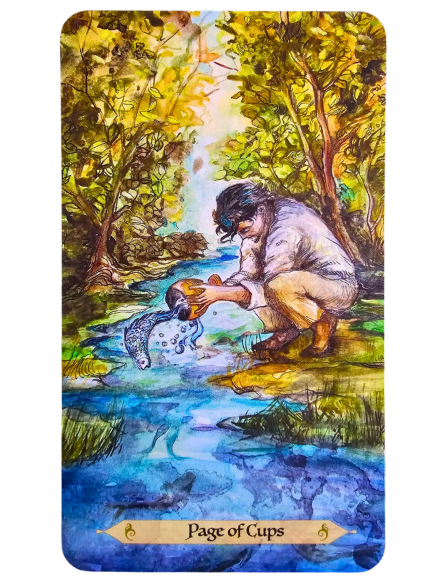 The Page of Cups is the only court card to be set on a stage. That got me interested. If Pages are simplified to being messengers then is his message sincere? Often I used to see the fish as his intuition talking to him. But then I saw the Page of Cups in Ana Tourian’s Tarot of Echoes pictured above and I saw him very differently.