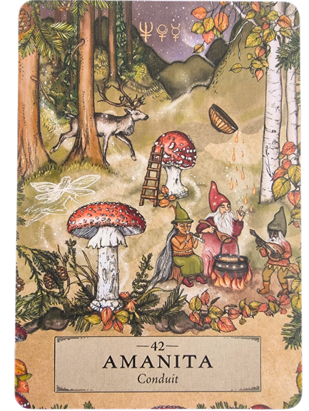 For example, in reference to the card above, 42 Amanita, she writes, “Commonly known as fly agaric or fly Amanita, this plant has been used in folk medicine since at least 6000 B.C.E., making it one of the earliest recorded entheogens – hallucinogenic plant medicines used for ritual and shamanic purposes.” She then explains how, why, and where Amanita was used. The card meaning section wraps up with the divinatory meanings.