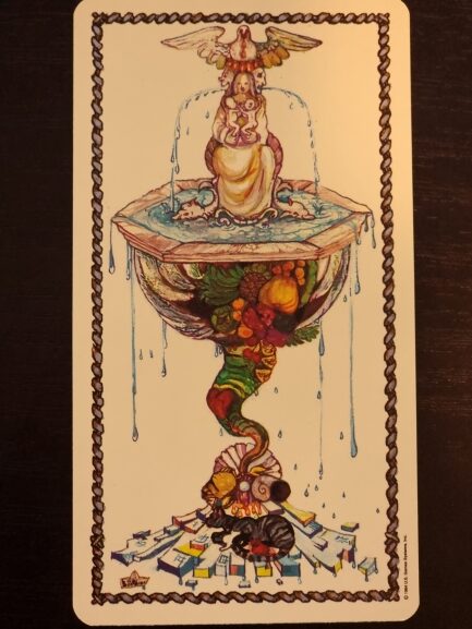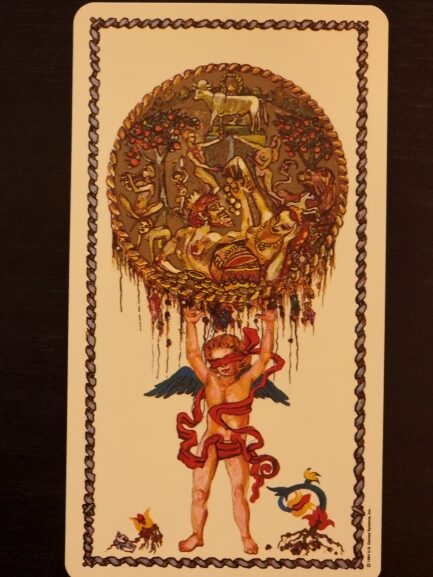 The images at this Emperor’s feet show the apocalyptic power of the elements. Water is shown sinking ships and fire ravages buildings. So much can be drawn from this, but if Stuart Kaplan, then President of US Games, is anything to go by, appearances can be misleading. If rather than Googling him, I had based my perceptions of Kaplan on this card, I would have formed a completely different impression of the man others have described as kind-hearted, supportive, encouraging, and enthusiastic.