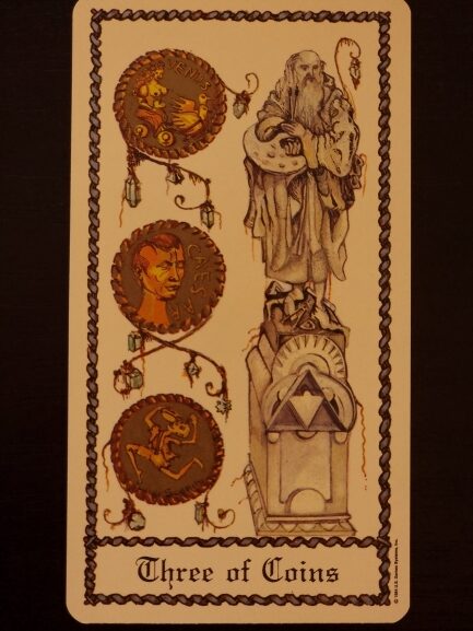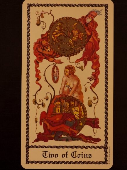 For example, the 2 of Coins represents the Old Testament story of Suzanna and The Elders. In this story, after false accusations are overturned, Suzanna’s virtue is restored and the men that made them, in retaliation for being shunned by her, are punished instead. I like this card but without the book I wouldn’t have recognised the reference. Nor would I have connected the idea of the truth winning out with this card. And yet, this, combined with the references to Mercury and communication and books and writing make this a powerful image for me. The lies I’ve told myself and that I’ve let myself believe about writing, can be overcome.