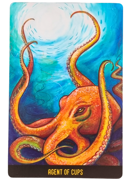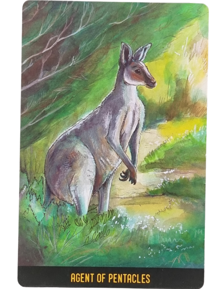 The Agent of Cups appeals to me purely because I love octopuses. Whereas I like the kangaroo on the Agent of Pentacles for two reasons. One is because it is nice to see an animal native to Australia on a deck created by an Australian artist and two because of the symbolism. Kangaroos can’t jump backwards. They can make great leaps, up to 9 metres in a single bound, but they can also move quite slowly. The point is they move forward just like the Agent of Pentacles. I often hear people say he needs to get moving or he’s too slow but I don’t see him like that. I see him as reliable and dependable and like the kangaroo he keeps moving forward towards his goal.