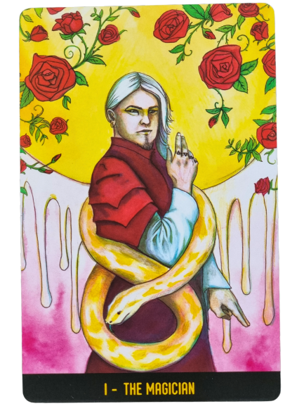 I The Magician stood out to me because, like many cards in The Penumbra Tarot, it helped me to relook at certain ideas. For example, since the snake doesn’t form a complete lemniscate it suggested to me that when we expand our thinking to explore something new, that is when we leave our centre point and head out in a direction, we are not the same when we return. Whatever we choose to manifest will bring about change. So we need to give careful consideration to what we think it is we want and where it will lead us.