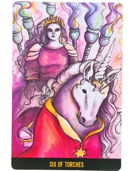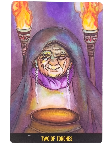I needed the book to help me understand the 2 of Torches too. It felt so very different. The story behind the card is that the elderly woman offers you a drink from her cauldron that will sustain you on the journey ahead. Reading that and incorporating my knowledge of the 2 of Wands made me think that we need to trust that if we leave our comfort zones we will find and receive the support we need to help us keep going. Now that I understand the idea behind the drawing I really appreciate this card. It came up in a personal reading I did this morning and the message was perfect.