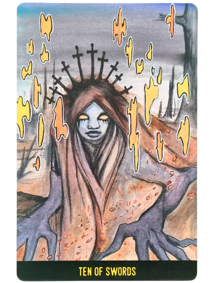 The book gave me more clarity on the two cards above too. Bushfires may initially ravage landscapes but afterwards the bush regenerates. Furthermore, certain seeds require the intense heat generated by fire to open. This is a powerful way to share the message of the 10 of Swords. I just didn’t understand that was what the card image was representing until I read the book.