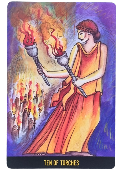 I love the choice of the spider on the web for the 9 of Torches above. A spider has to constantly repair its web if it is to survive and so it does. There’s no question, the spider just has to put in the work each day. Therefore, for me, this card is about doing what needs to be done in order to achieve your objective. This has stuck with me to such an extent that I flashed to this card when the 9 of Wands came up during a reading with another deck.