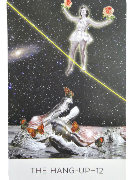 This version of The Hanged Man, here 12 The Hang-up, provides a possible solution. It is more active than most representations. Rather than seeking to gain a new perspective this woman needs to focus. The crocodiles lying in wait beneath her have probably given her all the focus she needs. If she starts to look down to see what they are doing things might not end so well.