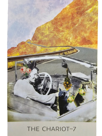 7 The Chariot takes it a step further. Here, this lady is moving faster. She’s putting her tunes on and moving through the burning landscape. There is a lot of energy here. I like that she looks happy and that she is in charge. I also like the addition of the cats because they add to the sense of independence. There’s no fear. She can see the path and she’s ready to follow it.