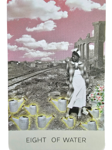 I draw several stories from this Eight of Water but the first one that came to mind was that she’s moving away from the train tracks because she no longer wants her direction governed. I almost hear her saying, “That’s not for me anymore. Thanks but no thanks. I need to go this way.” The image suggests she’s choosing what she wants to water and the flowers are responding accordingly.