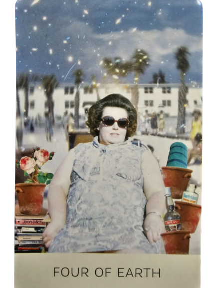 In contrast I look at the Four of Earth and I see excess. Actually, to be honest the first thing I saw was the vodka bottle at the forefront with the yoga mat relegated to the back position – out of sight and out of mind. This woman seems to have it all but there’s no sense of appreciation. She’s just surrounded by stuff that she, or someone else, had to lug to the beach. Yet, it doesn’t look like she’s going to use any of it.