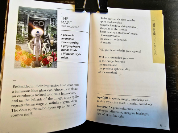 Spanning two pages, each Major Arcana entry has a full-colour image, alongside the title with its RWS equivalent name in brackets below, followed by a description of the image, and a poem. Keywords for both upright and reversed are presented in a footnote fashion on the second page.