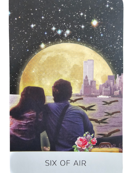 The Six of Air suggests cutting things away. It gives a slightly different perspective to the usual 6 of Swords. In this instance, the bag that sits alongside them gives me a sense of the things they have decided to keep. I see a return to a simpler way of life, away from the hustle and bustle and I really connect with this card.