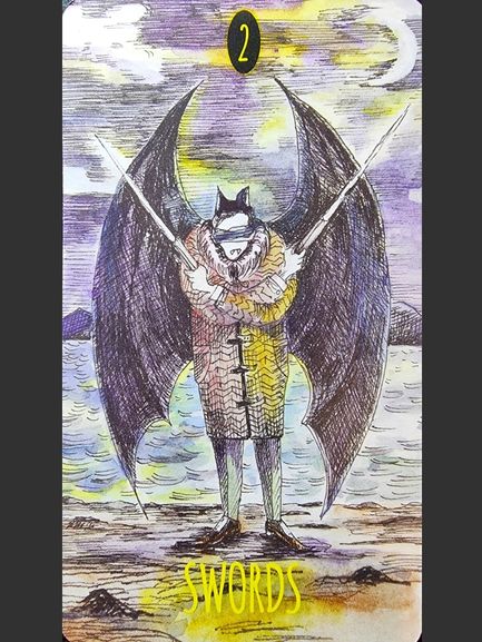 Some cards look very familiar but as is the case with the 2 of Swords pictured below, for me they aren’t. The bat changes everything. Bats don’t rely on sight so the relevance of the blind fold becomes more pointed. Bats listen. They are tuned to recognise their own unique calls. They send their sound out, it bounces off things in their environment, and in this way they are able to locate what they are looking for. This feels so much more positive a rendering than many decks.