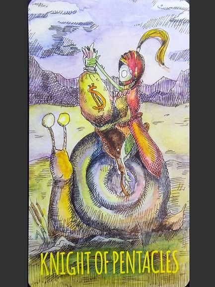 The Knight of Pentacles, also pictured below, is another card I like because it adds the idea that “just because you can doesn’t mean you should.” In this card a grasshopper, capable of great leaps forward, chooses to ride on a snail’s back. Sometimes slow and steady is the way to go. It’s maintainable and allows you to stay aware of what’s going on both around you, and within you, as you move towards your goals. Whilst not as flashy and possibly not as appealing as the Knight of Wands or the Knight of Cups, this Knight gets things done. It’s not all about the show.